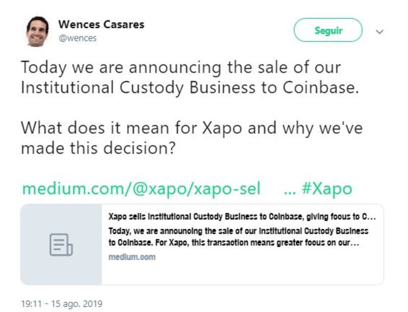 La compañía de criptomonedas Coinbase confirmó que adquirió el negocio de custodia de Xapo, un servicio muy conocido por almacenar bitcoins en bóvedas debajo de montañas suizas. Xapo fue fundada por el emprendedor argentino Wences Caseres y gran parte de su negocio radicaba en almacenar billeteras "frías" de Bitcoin.