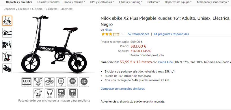 Esta bicicleta eléctrica plegable destaca por ser un modelo elegante, ligero (pesa 18 kilos incluida la batería) y compacta. Alcanza una velocidad de 25 km por hora, dispone de luz delantera, trasera, herramientas y candado incluido y tiene tres velocidades distintas. Y lo no menos importante, se trata de una bici de lo más económica dentro de su segmento. . Recordemos que la media de estas bicis está entre 1.000 y 5.000 euros, un precio que no todos están dispuesto a pagar. En este caso, gracias al descuento de Amazon actualmente podemos disfrutar de ella por 383 euros gracias a al descuento actual de 316 euros.