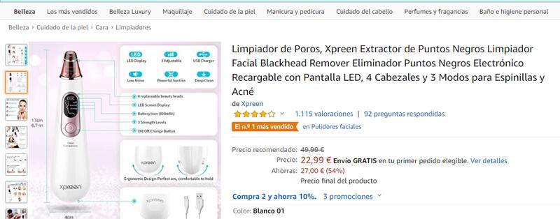 Incluye cuatro cabezales para cada una de las zonas a tratar (frente, pómulos, nariz o barbilla) y tres modos distintos de uso. Además, su pantalla LED muestra la carga de la batería, que tiene una duración de hasta tres semanas con una sola carga. Amazon nos ofrece actualmente una rebaja del 54%: se pagan menos de 25 euros.