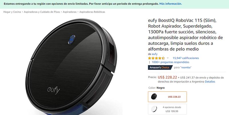 Los llamados "robot aspiradora" son un furor en todo el mundo. Funcionan de manera automática y permiten limpiar casi cualquier superficie de manera eficiente. Este modelo, de oferta en Estados Unidos, tiene tecnología BoostIQ: aumenta automáticamente la potencia de succión dentro de 1. 5 segundos cuando se necesita una fuerza de aspiración adicional para obtener la mejor limpieza. Además, hacen muy poco ruido y llegan a aspirar hasta 100 minutos en suelos de madera dura con una succión constante. Se venden a US$ 228.