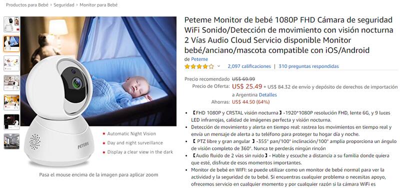Este es uno de los productos más vendidos en Amazon. Se trata de una videocámara para cuidar a los más pequeños de la casa. Tiene una definición de 1920x1080P resolución FHD, lente 6G, y 9 luces LED infrarrojas, calidad de imágenes perfecta y visión nocturna. Funciona con WiFi. Se vende actualmente por US$ 25.