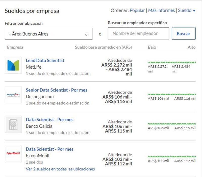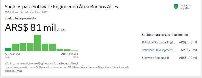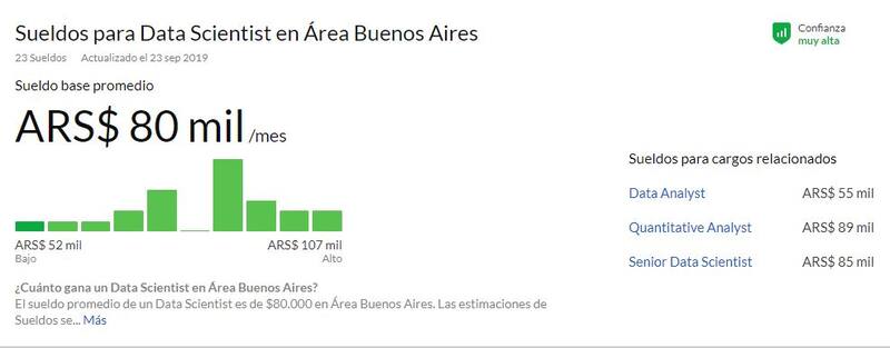 En este mismo segmento vale incluir al ingeniero de software, que tiene un sueldo muy similar aunque levemente más alto que el del científico de datos.