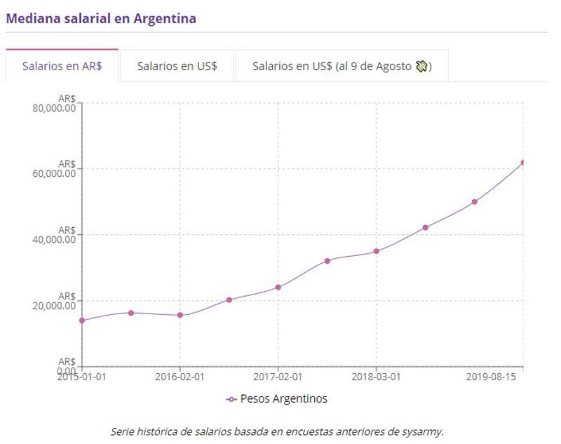 Los datos se dieron a conocer a través de la encuesta conjunta que realizan SysArmy, la comunidad local de sistemas que nuclea a profesionales del sector, y Openqube, la plataforma de opiniones reales de empresas donde sus empleados las califican en base a su experiencia laboral. Esta es la onceava edición y por lo tanto se observa la progresión de los sueldos en el sector a partir de 2014 y los ajustes que percibieron los trabajadores en 2019.