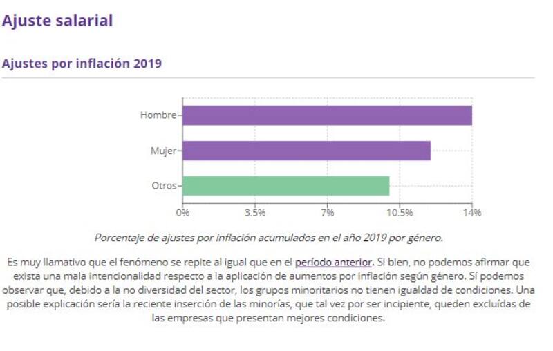 En términos de ajuste salarial. Según los datos, a los hombres se les ajustó el salario en un 14% mientras que a las mujeres en un 12%. En este sentido, la demografía de la encuesta revela que un 85% de las respuestas corresponden a hombres mientras que un 14% a mujeres (la categoría "otros" se correspondió con el 0,43% de las respuestas).