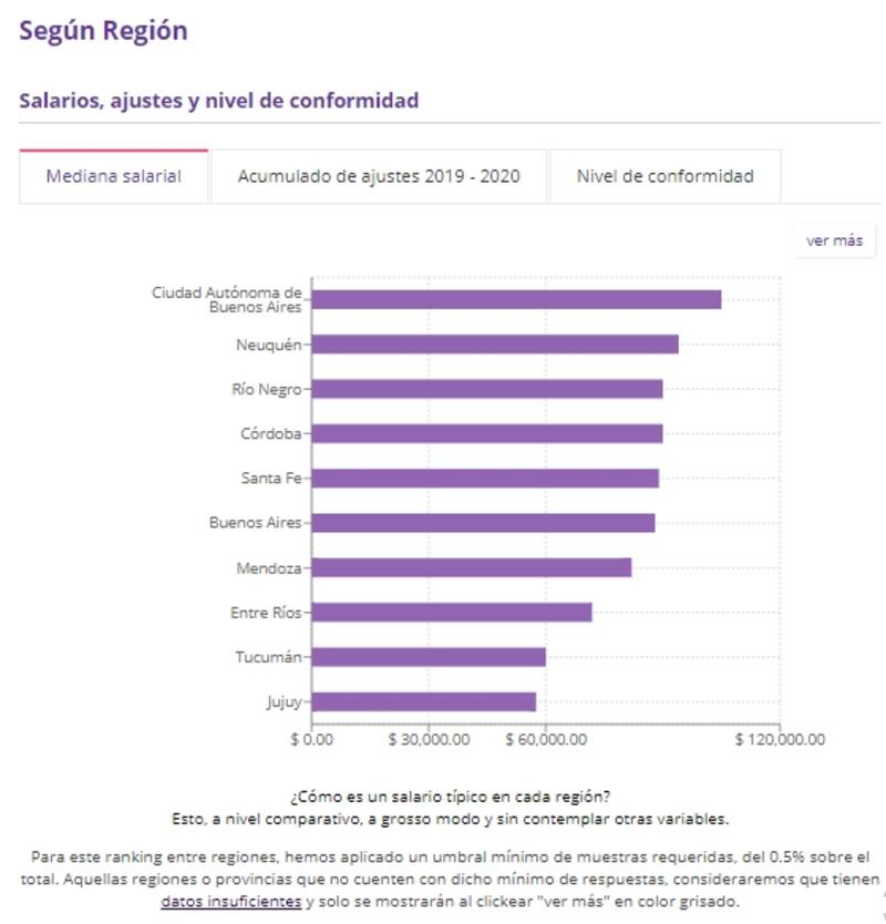 En función de la zona geográfica también se observan diferencias en la retribución a los trabajadores de IT. La Ciudad de Buenos Aires tiene la distribución más alta (unos $ 105.000), seguida de Neuquén ($ 94.050), Río Negro y Córdoba ($ 90.000). En la provincia de Buenos Aires, la media salarial asciende a $ 88.000. En el último peldaño se encuentra Jujuy con $57.500.