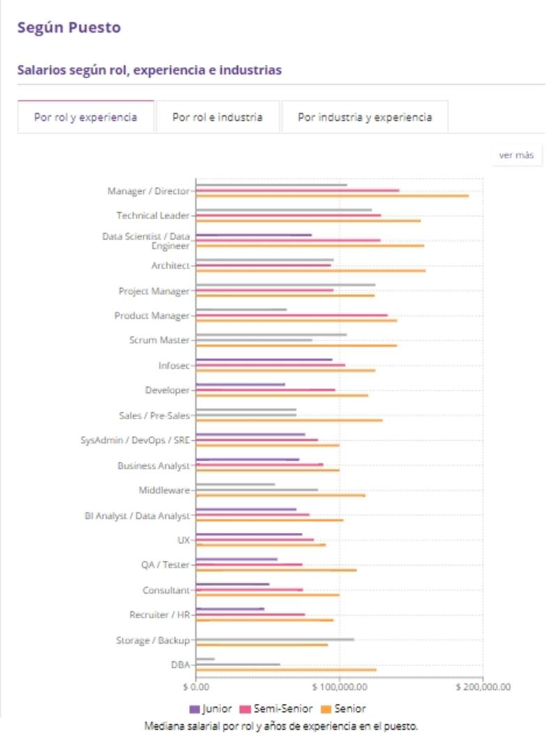 Según el estudio, en promedio, los puestos mejor remunerados son Gerentes/Directores, con sueldos superiores a los $190.000, seguidos por arquitectos, líderes técnicos y product managers, que van de los $122.500 a los $160.000 brutos.