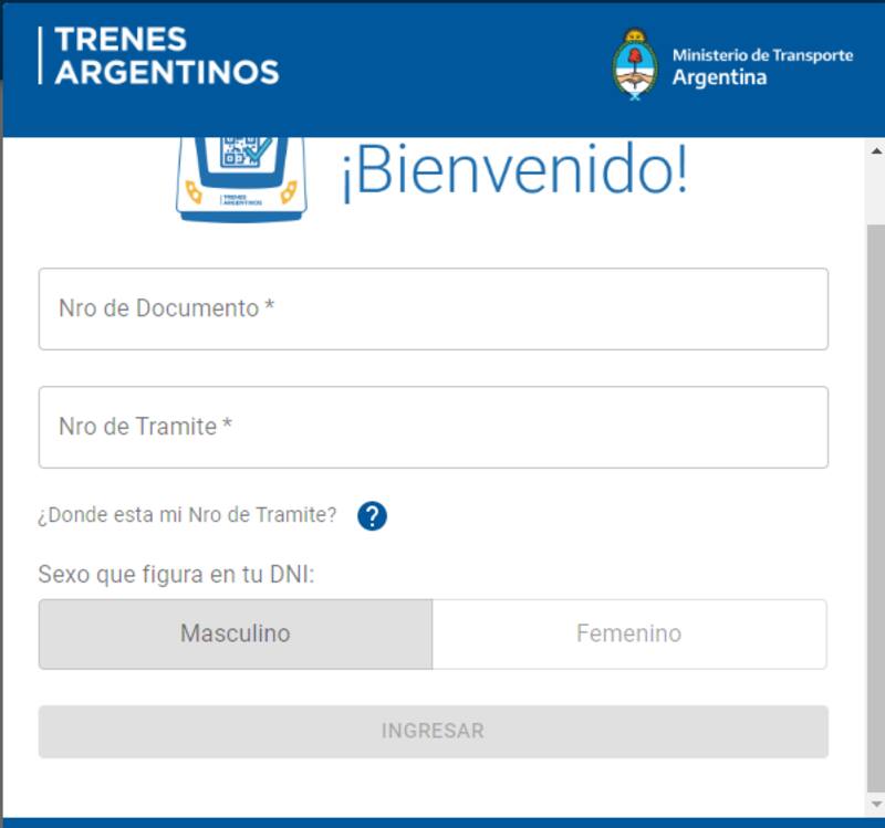Una vez que elijas uno de los tres medios que mencionamos arriba para reservar tu tren, el sistema pedirá que al usuario ingresar sexo, número de DNI y el número de trámite que figura al frente.