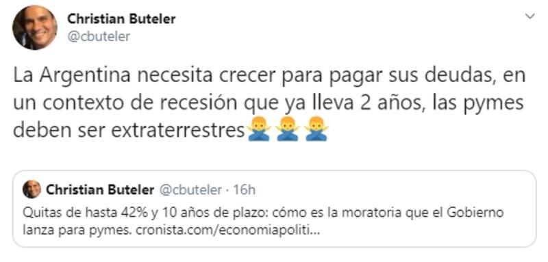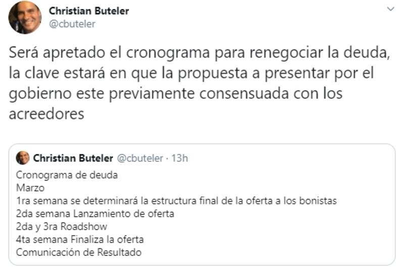 En su cuenta personal de la red de microblogging Christian Buteler (@cbuteler) detalló que “será apretado el cronograma para renegociar la deuda y expuso que la “clave estará en que la propuesta a presentar por el Gobierno esté previamente consensuada con los acreedores .