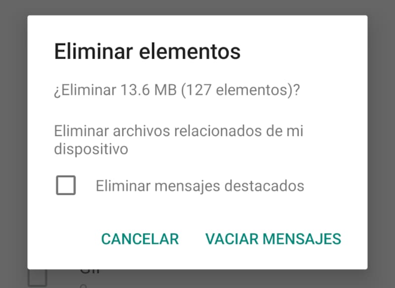 WhatsApp preguntará entonces si pretende eliminar los elementos o cancelar. Si el usuario clickea sobre Eliminar los elementos aparecerá otro cartel que preguntará Eliminar archivos relaciones de mi dispositivo. Además permitirá incluir un visto en un recuadro para eliminar mensajes destacados.
