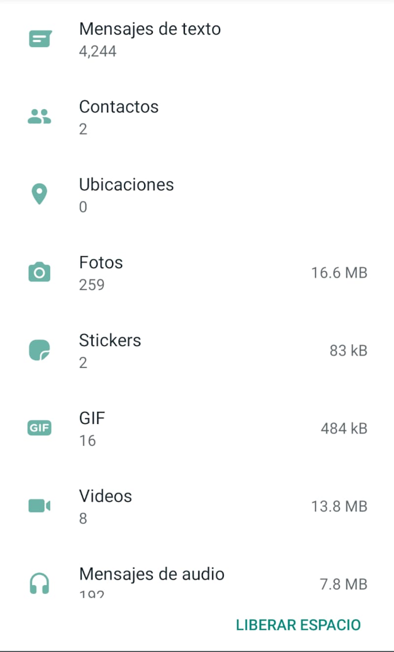 Al dar clic sobre el nombre del contacto, WhatsApp mostrará la cantidad de mensajes de texto, contactos, ubicaciones, fotos y stickers que fueron compartidos entre ambos usuarios. Este apartado también el nivel de interacción que posee el usuario con los grupos que integra.