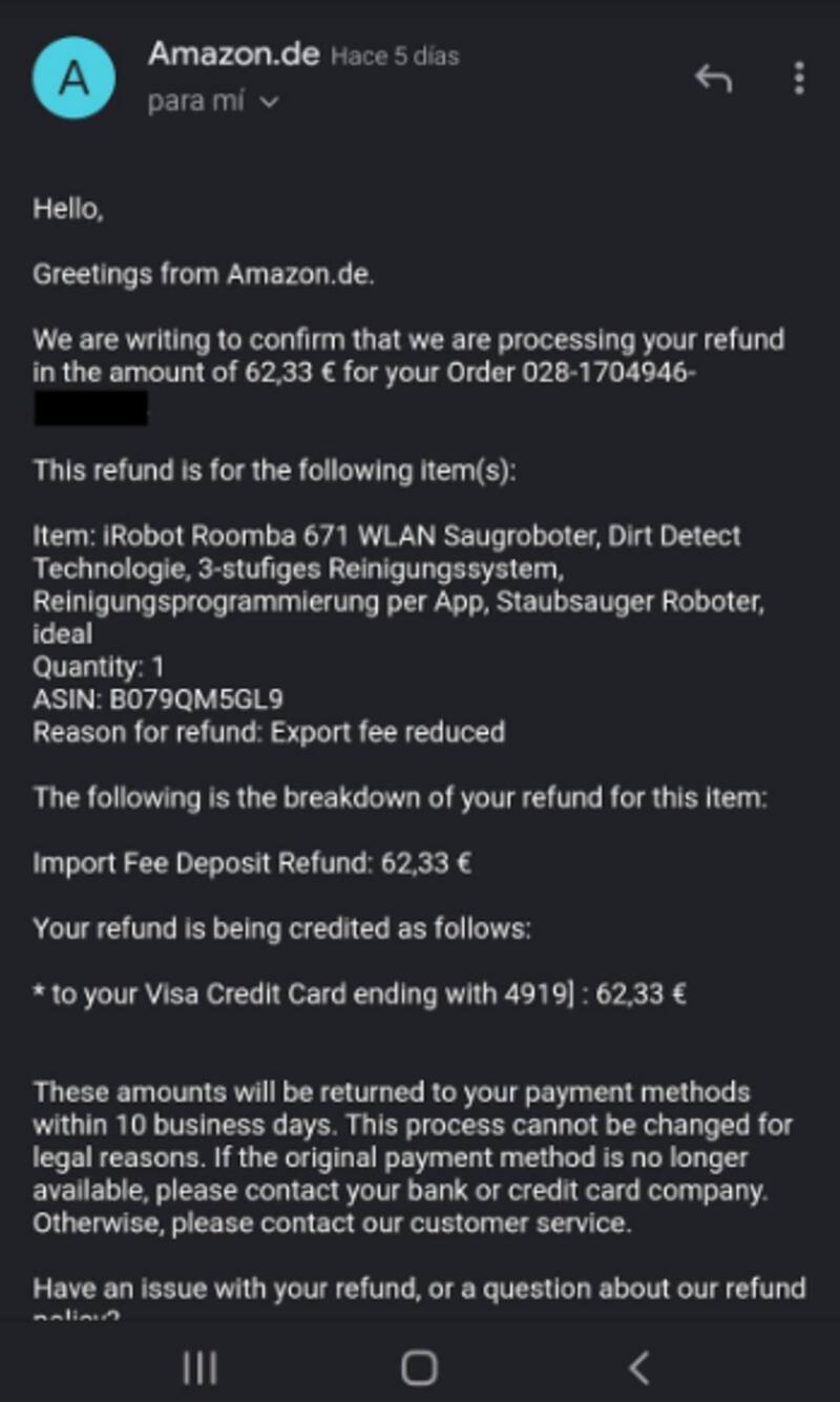 A un cliente le devolvieron $ 11.000 (se ve que pago en pesos argentinos) y a otro, más de 600 euros (pago en moneda extranjera). En cualquier caso, desde Oportunidades Online aclaran que, “de corresponder la devolución, se realiza a los 51 días de enviada pero “lamentablemente no se puede saber al comprar si amazon va a hacer la devolución , comentaron en diálogo con INFOTECHNOLOGY.