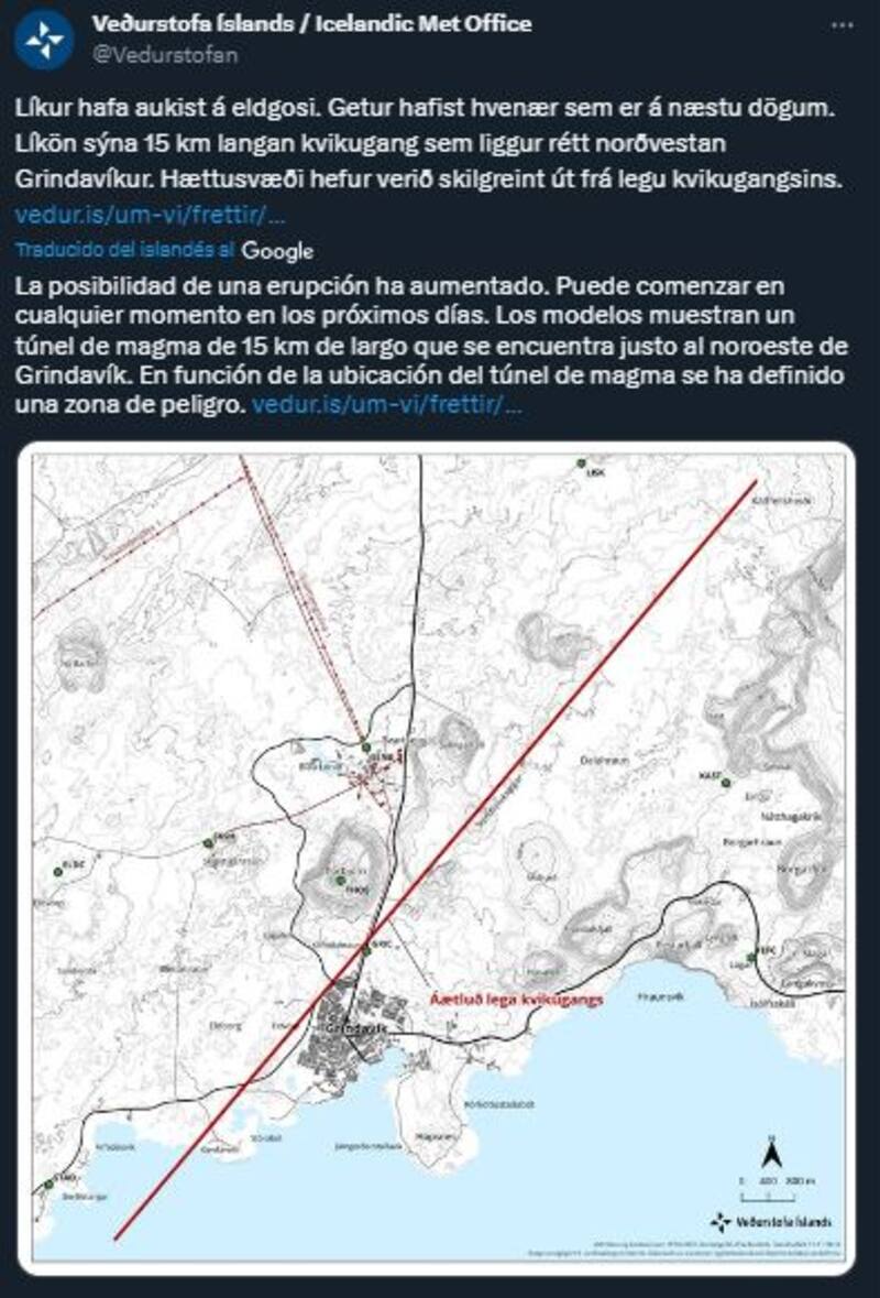 "Se desconoce la ubicación exacta de un posible lugar de erupción, pero la longitud de 15 kilómetros y la orientación del dique ofrecen una buena indicación de posibles fuentes", añade el comunicado.Las autoridades islandesas declararon el viernes la situación de emergencia tras una serie de terremotos cerca de Gindavík y advirtieron de una posible erupción volcánica, por lo que ordenaron una evacuación preventiva de esta ciudad a 50 kilómetros de la capital, Reikiavik.