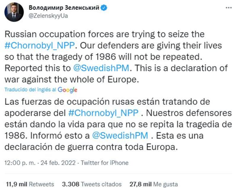 "Las fuerzas de ocupación rusas están tratando de apoderarse de la planta de energía nuclear de Chernobyl.Nuestros muchachos están dando la vida para que la tragedia de 1986 no vuelva a ocurrir", dijo el mandatario desde su cuenta en Twitter.