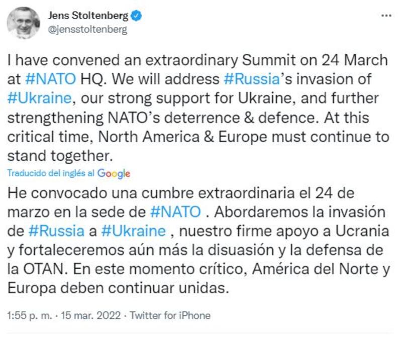 El secretario general de la OTAN, Jens Stoltenberg, anunció en Twitter que la Alianza celebrará una cumbre extraordinaria el próximo 24 de marzo, para expresar la solidaridad de los países que la integran con Ucrania.