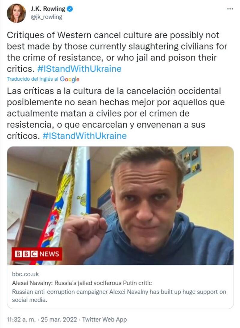 "Las críticas a la cultura de la cancelación no las hacen mejor los que masacran a los civiles", expresó. Y compartió un artículo sobre Alexei Navalny, el principal crítico del Kremlin, que hace poco cumplió un año de cárcel.