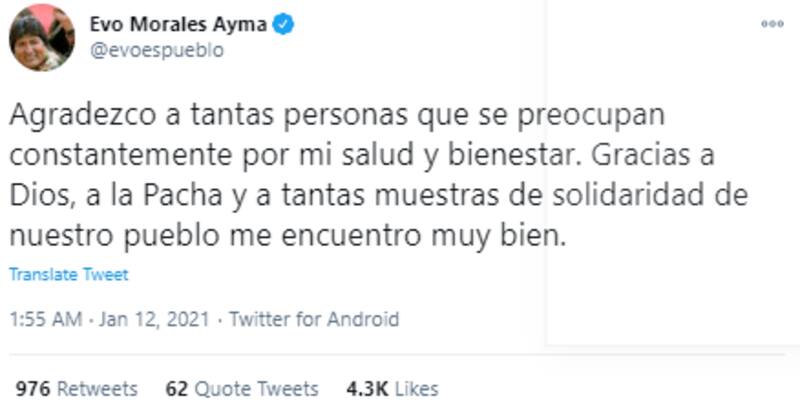 No obstante, tiempo después Evo Morales se pronunció a través de la red social Twitter y dio las gracias por el apoyo y preocupación de la gente. "Agradezco a tantas personas que se preocupan constantemente por mi salud y bienestar. Gracias a Dios, a la Pacha y a tantas muestras de solidaridad de nuestro pueblo me encuentro muy bien", escribió.