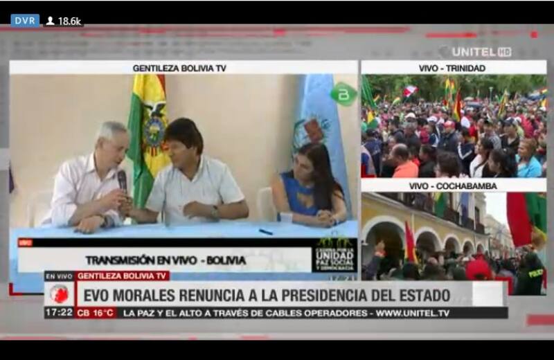 En un discurso divulgado en televisión, el mandatario de Bolivia, Evo Morales, renunció hoy a la presidencia, en el marco de la escalada de la crisis política, después de que la auditoría de la Organización de Estados Americanos (OEA) pidiera la repetición de las elecciones presidenciales del 20 de octubre y que el Ejército le sugiriera a Evo renunciar, junto a una catarata de dimisiones de funcionarios.