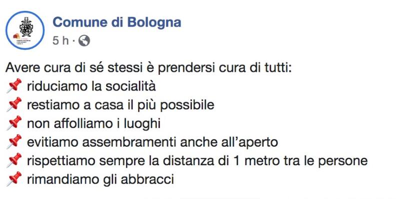 En este sentido, las redes sociales reflejan el aumento vertiginoso de medidas de todo tipo que se están recomendando. En la comuna de Boloña, por ejemplo, instaban a "reducir la socialización, quedarse en casa, respetar un metro de distancia y no dar abrazos".