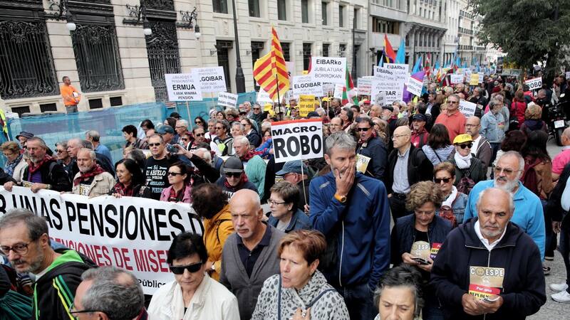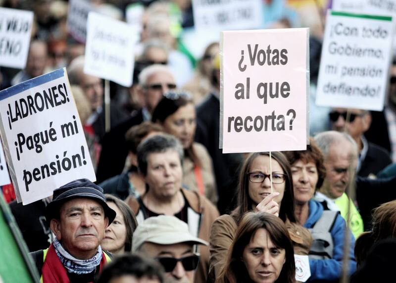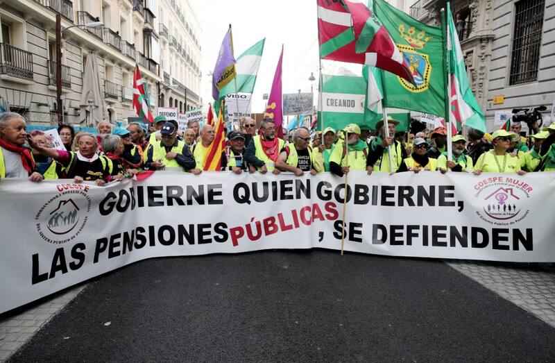 Bajo una gran pancarta que decía "Gobierne quien gobierne las pensiones públicas se defienden", la Coordinadora Estatal por la defensa del sistema público de pensiones (Coespe) congregó a asociaciones de jubilados y movimientos de pensionistas que exigen que la pensión mínima llegue a los 1080 euros (u$s 1100) o que se iguale con el Salario Mínimo Interprofesional (SMI) de 1200 euros (u$s 1325).