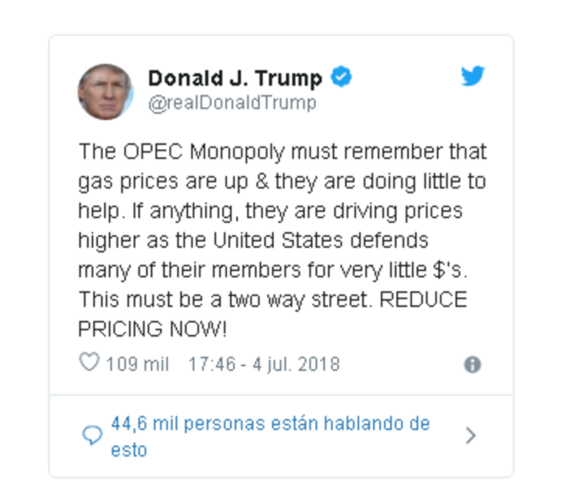 "Es muy importante que la OPEP incremente el flujo de Petróleo. Los Mercados Mundiales están frágiles, el precio del Petróleo está subiendo demasiado. ¡Gracias!", tuiteó Trump, tras lo cuallos futuros delcrudo aumentaron sus pérdidas.