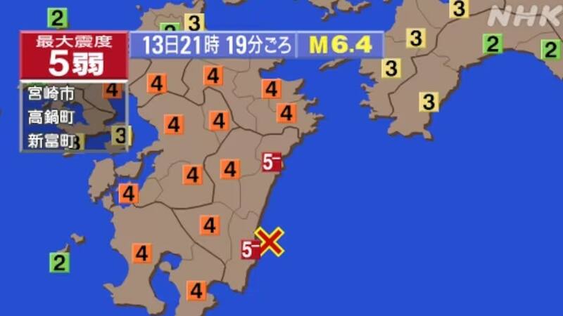 En Miyazaki, el terremoto alcanzó el nivel 5 bajo en la escala japonesa, con un máximo de 7 y centrada en medir la agitación en la superficie y las zonas afectadas, más que en la intensidad del temblor.