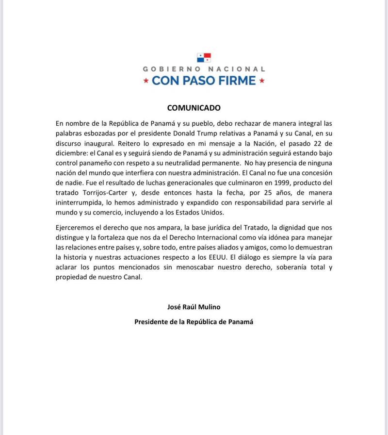 En un comunicado que publicó en su cuenta de X, José Raúl Mulino, dijo que reiteraba lo que ya expresó en un mensaje a la nación del 22 de diciembre: "El Canal es y seguirá siendo de Panamá y su administración seguirá estando bajo control panameño con respeto a su neutralidad permanente".
