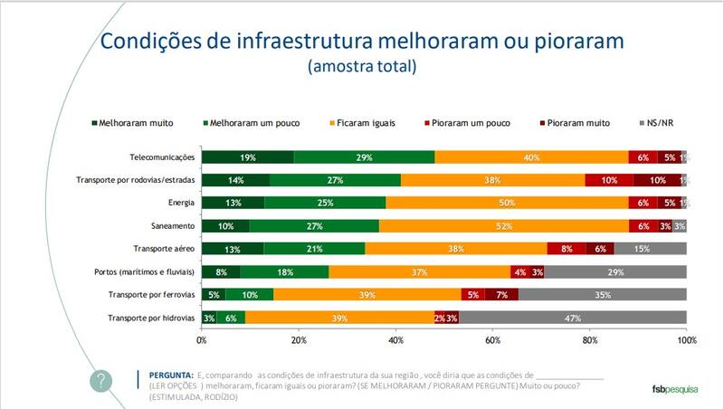 Acorde a una encuesta de agosto a cargo de FSBPesquisa -por encargo de la Confederación Nacional de la Industria- la infraestructura es la demanda base por parte de los empresarios brasileños a sus candidatos. La logística por hidrovía y las líneas ferroviarias son las que se llevan la peor calificación por oposición a las más ponderadas en la actualidad: la energética, que viene creciendo en el campo de las matrices renovables -con récord de 18 gigabytes en la generación eólica-, las telecomunicaciones y el transporte aéreo.