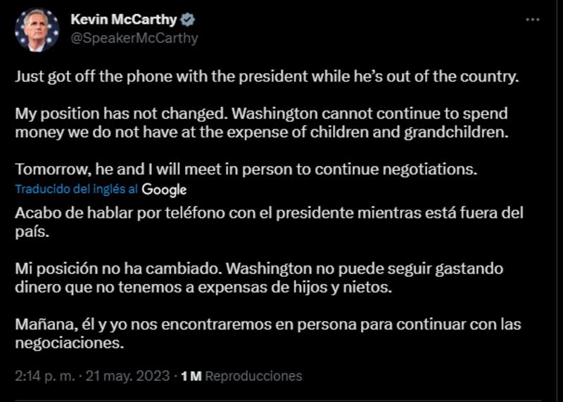 Los dirigentes conversaron hoy, mientras Biden volvía de la reunión del G7 en Japón, y acordaron reunirse mano a mano mañana, lunes, informó McCarthy en su cuenta de Twitter y confirmó la Casa Blanca.