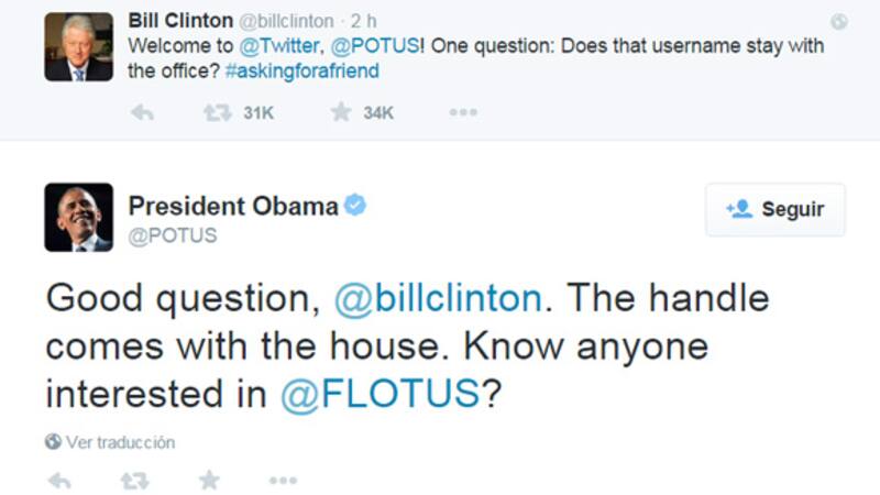 Uno de los primeros en interactuar con Obama fue el ex presidente norteamericano Bill Clinton, quien es a su vez el marido de Hillary Clinton, la candidata demócrata favorita de cara a las elecciones presidenciales del año que viene. "Bienvenido a Twitter, @POTUS (President Of The United States). Una pregunta: ¿ese nombre de usuario se va a quedar en la oficina?", bromeó Clinton, quien además remató el tweet con el hashtag #PreguntoParaUnAmigo, en clara alusión a su mujer.