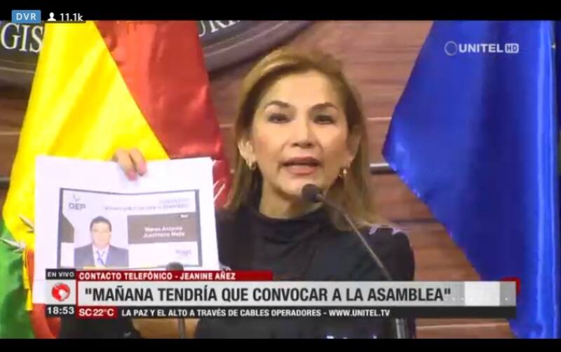 En la cadena de sucesión constitucional, la principal opción es la senadora de la opositora Unidad Demócrata (UD) Jeannine Áñez, que es también la segunda vicepresidenta del Senado, que ya ayer había expresado su disposición a asumir de manera transitoria.