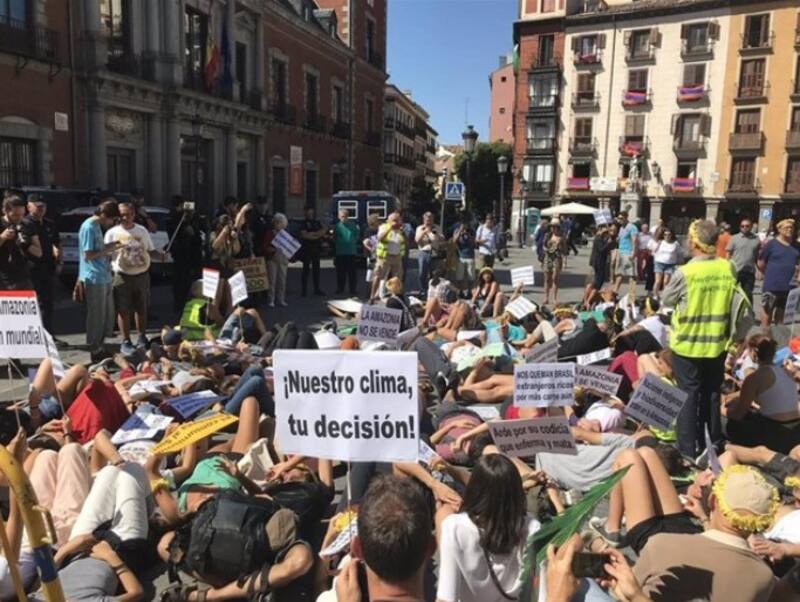 Extinction Rebellion, Ecologistas en Acción, Greenpeace, Fridays for Future y la campaña No a los Tratados de Comercio e Inversión protestaron hoy frente al Ministerio de Asuntos Exteriores en Madrid para exigir que se retire el apoyo al tratado con Mercosur, así como una postura contundente en defensa de la Amazonia. Las protestas también se realizaron en Barcelona y Tenerife.