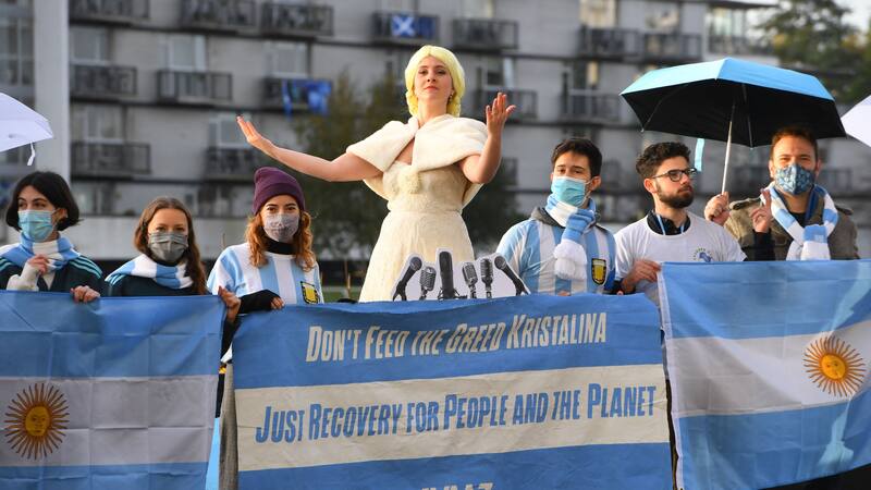Una mujer disfrazada de Eva Perón apareció hoy en los alrededores de donde se lleva a cabo la conferencia del clima COP26 en la ciudad escocesa de Glasgow, en una acción llevada por varias ONGs para reclamar a los países desarrollados a que cumplan su promesa de dar ayudas financieras o condonen deudas para que los de ingresos medios y bajes logren los objetivos medioambientales.