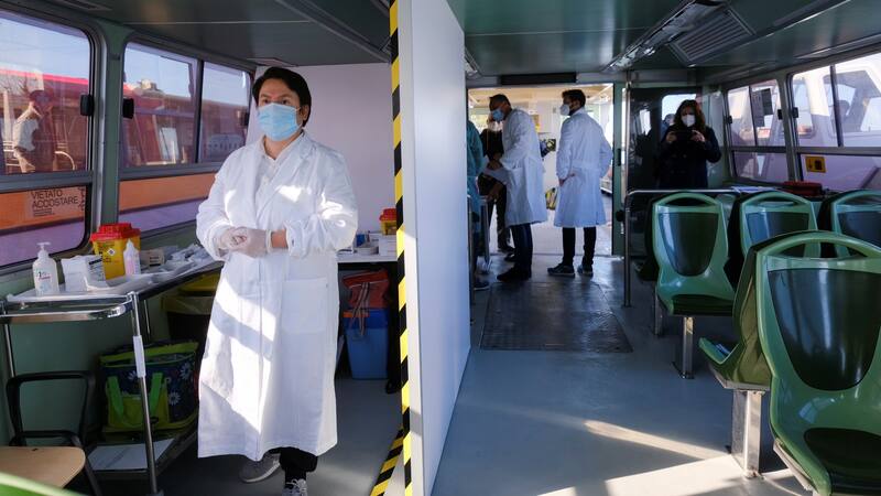 En Venecia desde hoy también vacunan en un vaporetto (taxi fluvial) que fue acondicionado para tal fin y quedará anclado, y sólo inocularán allí a mayores de 80 años para minimizar su potencial contagio.