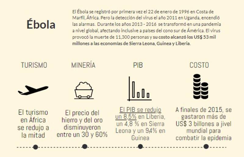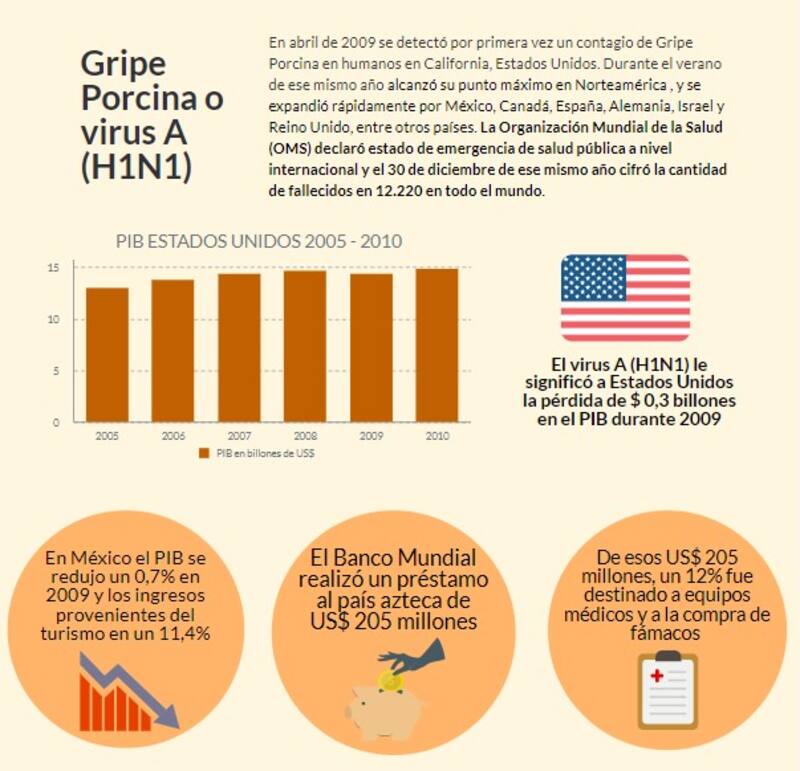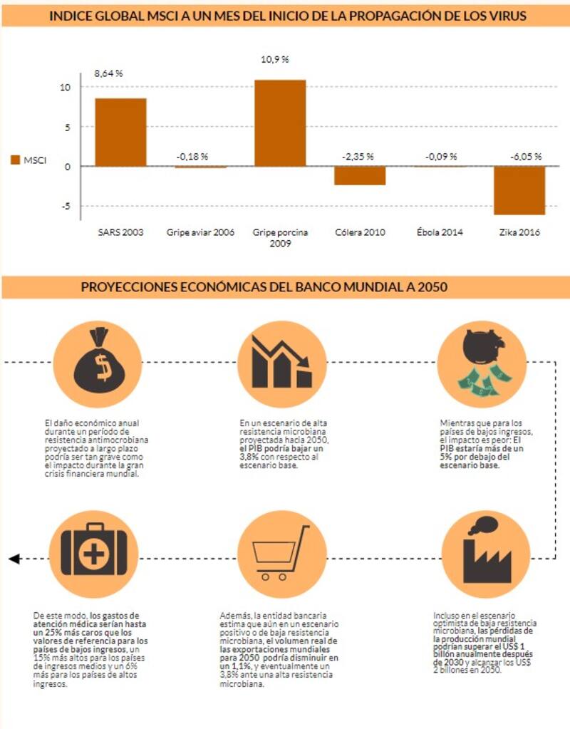 Con una economía globalizada, los efectos de este tipo de enfermedades se sienten en los mercados. Caídas de acciones ligadas al turismo, baja del PBI en los países más afectados y grandes gastos para controlar las emergencias han sido la tónica de enfermedades similares entre los años 2009 y 2016 como el virus A (H5N1) y de las pandemias A (H1N1) y el ébola.