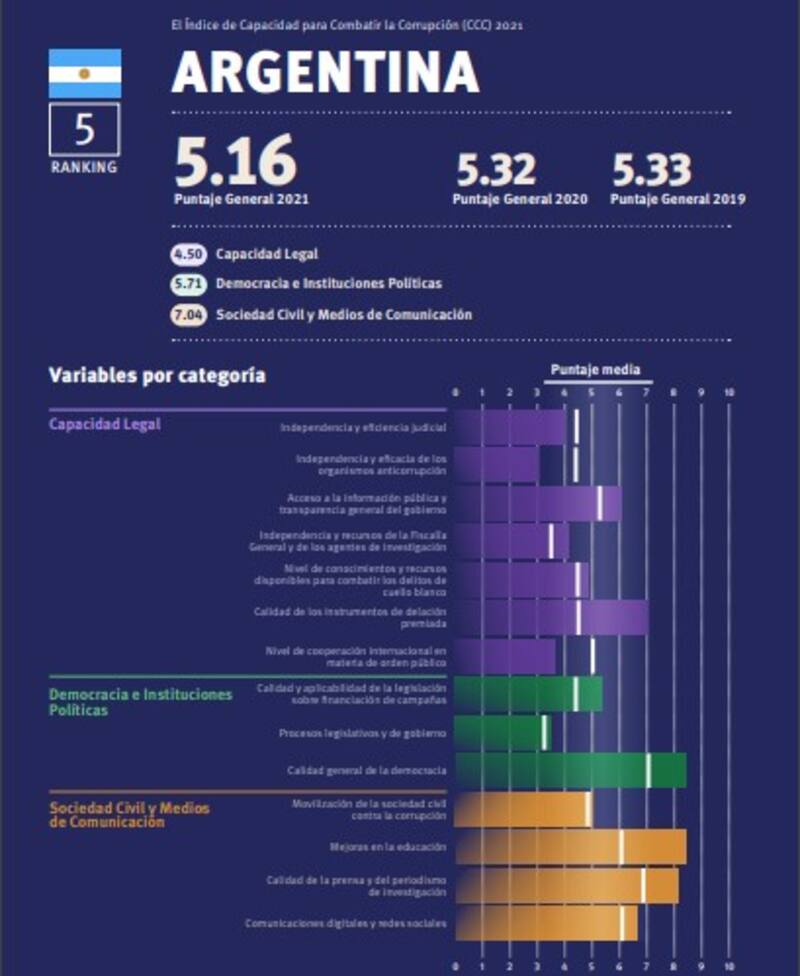 En la categoría de sociedad civil y medios de comunicación, Argentina supera la media regional en todas las variables y registró una mejora del 8%. Esto indica la "persistente vigilancia de la opinión pública en materia de corrupción".