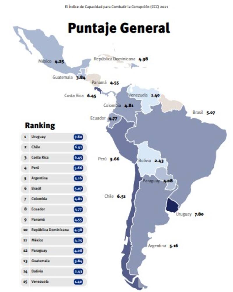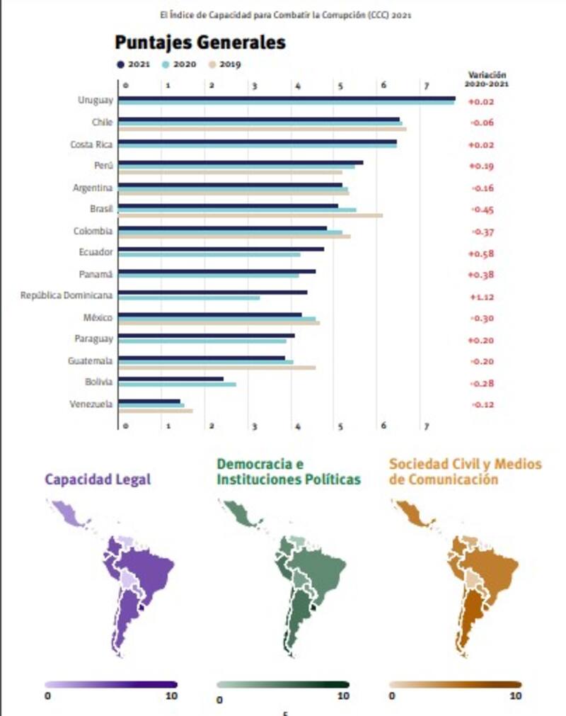 Argentinamejoró su posición en el Índice de Capacidad para Combatir la Corrupción (CCC) que releva anualmente la situación en 15 países latinoamericanos.