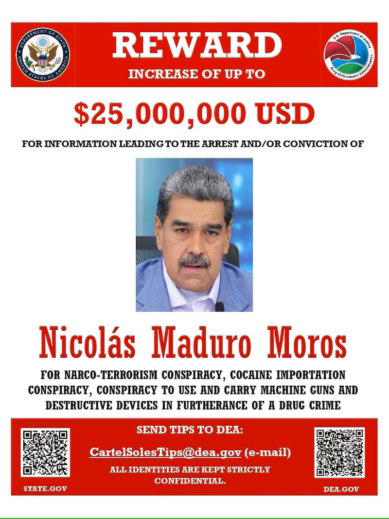 Se trata de la máxima recompensa que ofrece el gobierno de los Estados Unidos por su detención: mientras que antes alcanzaba los 15 millones de dólares, ahora este monto asciende a 25 millones.