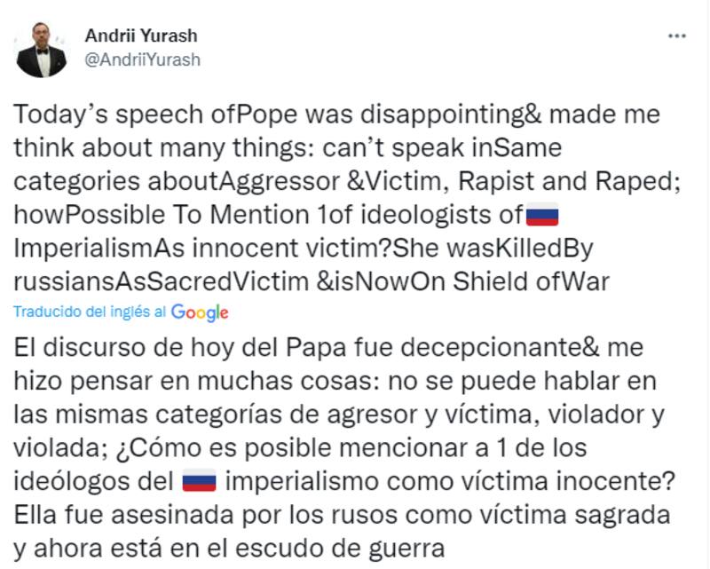 Yurash opinó que el Papa, al pronunciar estas palabras, habla "en las mismas categorías sobre agresor y víctima, violador y violada".