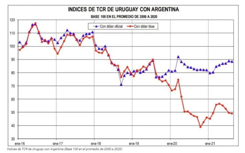 Según el monitor, es alrededor de un 34% más conveniente cruzar a hacer compras en Argentina. Este número es la caída del TCR bilateral de Uruguay con Argentina entre marzo de 2020 y agosto de 2021, considerando la serie del dólar "blue" tipo comprador en Buenos Aires.