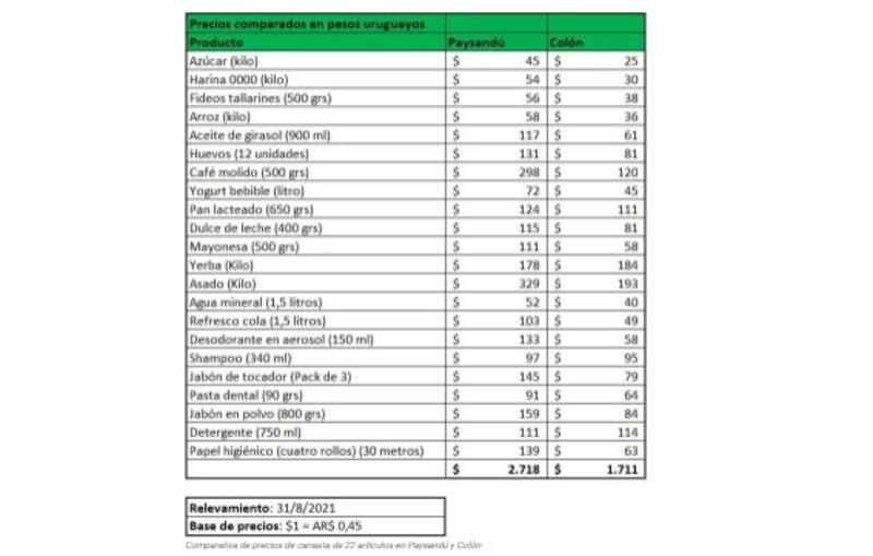 Si llevamos estos números al día a día de los ciudadanos del litoral, en la principal cadena de supermercados de Paysandú, una canasta integrada por 22 productos seleccionada por El Observador-entre los que hay harina, fideos, azúcar, arroz, pan, yerba, agua mineral, asado, junto con artículos de higiene personal y limpieza- tiene un costo de $ 2.718. La misma canasta en uno de los principales supermercados de Colón vale $ 1.711, lo que quiere decir un 37% más barato.