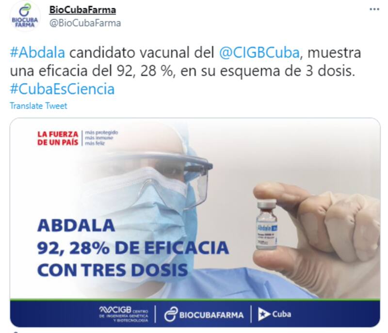 "#Abdala candidato vacunal del @CIGBCuba muestra una eficacia del 92,28%, en su esquema de 3 dosis. #CubaEsCiencia", escribió el laboratorio en un mensaje de Twitter.
