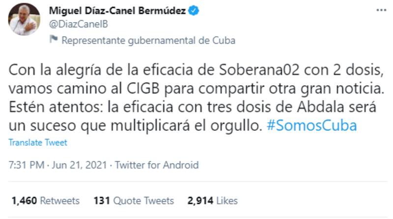 "La eficacia con tres dosis de Abdala será un suceso que multiplicará el orgullo", tuiteó el presidente Miguel Díaz-Canel, un poco antes de que se difundiera la noticia.