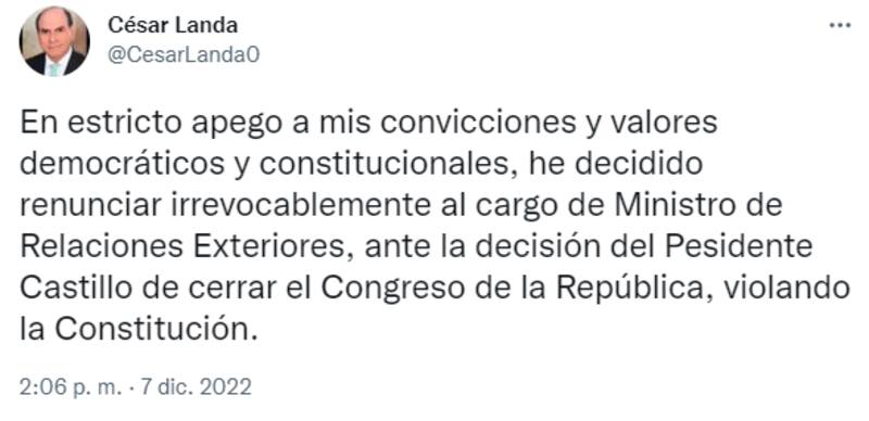 "En estricto apego a mis convicciones y valores democráticos y constitucionales, he decidido renunciar irrevocablemente al cargo de Ministro de Relaciones Exteriores, ante la decisión del Presidente Castillo de cerrar el Congreso de la República, violando la Constitución", indicó César Landa en su cuenta de Twitter.