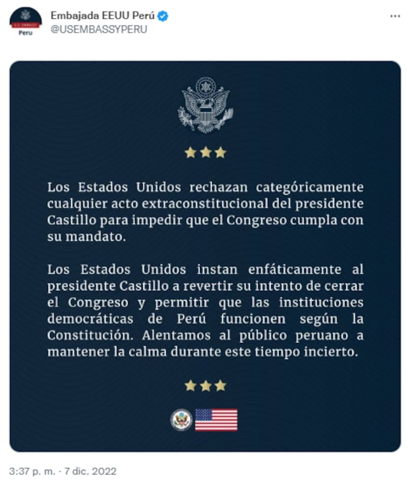 "Los Estados Unidos rechazan categóricamente cualquier acto extraconstitucional del presidente Castillo para impedir que el Congreso cumpla con su mandato", expresó la sede diplomática del país norteamericano en su perfil de la mencionada red social.