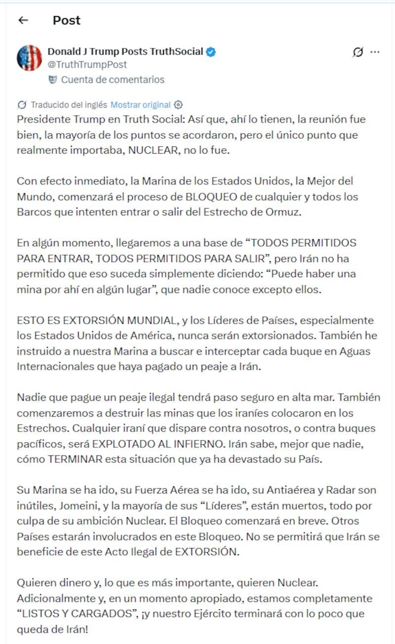 El mandatario sostuvo que la medida apunta a impedir lo que calificó como una práctica de “extorsión” por parte de Irán. “Esto es una EXTORSIÓN GLOBAL, y los líderes de los países, especialmente Estados Unidos, nunca serán extorsionados”, advirtió. En ese marco, ordenó además identificar y detener a los barcos que hayan pagado peajes a Teherán para transitar la zona.