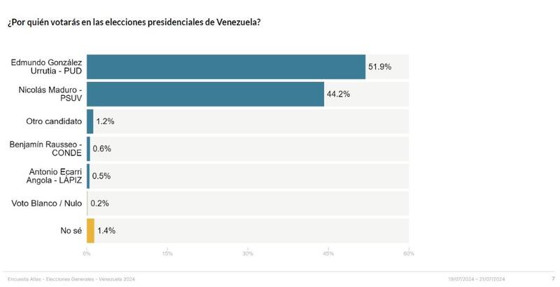Los datos muestran a un Edmundo González Urrutia al frente, con el 51,9% de los votos. En otro relevamiento realizado por Atlas Intel a fines de junio, el líder opositor concentraba el 52,7% de la intención de voto, perdiendo algo de apoyo en los últimos días de campaña.
