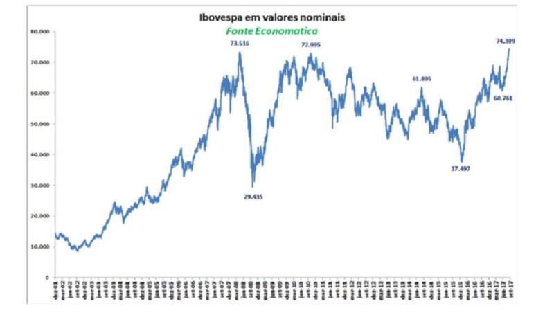 El índice de la bolsa brasileña Ibovespa alcanzó su máximo histórico nominal en reales al llegar a los 74.309 puntos, tras aumentar 1.240,36 enteros, un 1,70 por ciento.