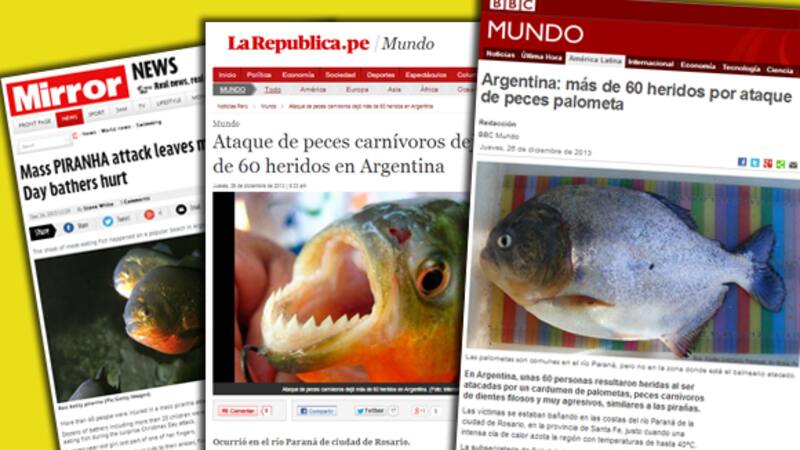 El portal británico sensasionalista The Mirror tituló: "Ataque masivo de pirañas en Argentina". La nota está acompañada de una impactante foto del pez carnívoro.