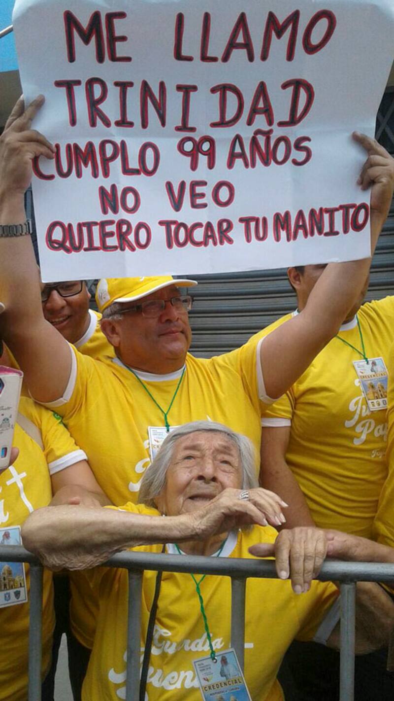 "Me llamo Trinidad cumplo 99 años. No veo. Quiero tocar tu manito", se leía en el cártel que una persona levantaba con el deseo de la anciana en espera de que lo viese el papa a su paso por las calles de Trujillo.