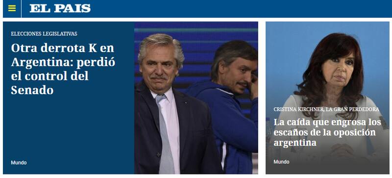 Desde el principal medio español destacaron la "remontada electoral inesperada" que "mantiene con vida al peronismo" pese a la victoria de Juntos por el Cambio a nivel nacional: "El peronismo ha sobrevivido a las elecciones de medio término celebradas este domingo en Argentina", dictamina El País en su nota de portada de Mundo.